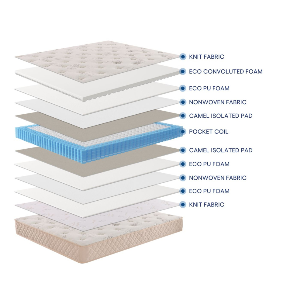 Высота 23 см. Независимые пружины Pocket (диаметр 2,0 мм) обеспечивают точечную поддержку, уменьшают передачу движения и гарантируют анатомически правильное положение во время сна. Усиленная краевая зона (7 см, плотность D30) предотвращает провисание матраса и продлевает срок его службы.